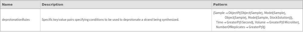 Sample ObjectP[{Object[Sample],Model[Sample],Object[Sample],Model[Sample,StockSolution]}] The solution which will be used to perform the deprotonation. Time GreaterP[0 Second] The amount of time for which the deprotonation solution will be mixed with the resin. Volume GreaterP[0 Microliter] The volume of deprotonation solution used. NumberOfReplicates GreaterP[0] Number of times the deprotonation step will be repeated. -