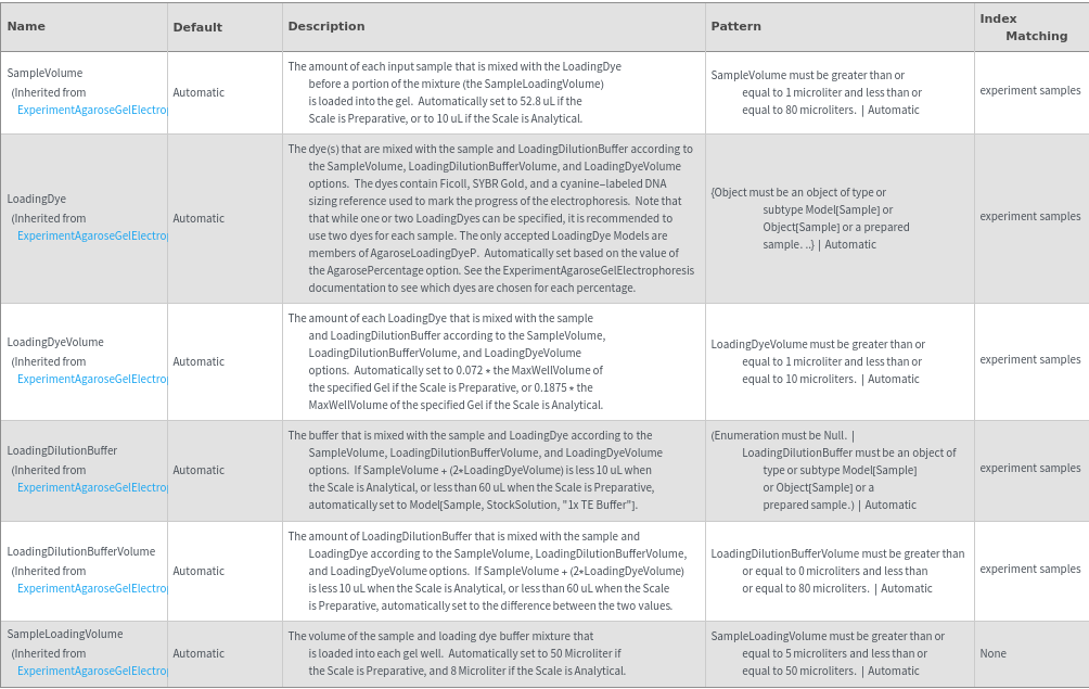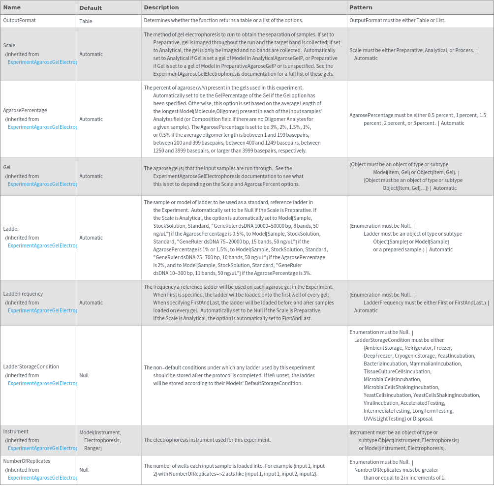 - The options returned by this function may be passed directly to ExperimentAgaroseGelElectrophoresis.
