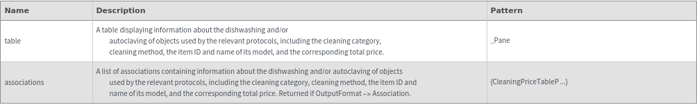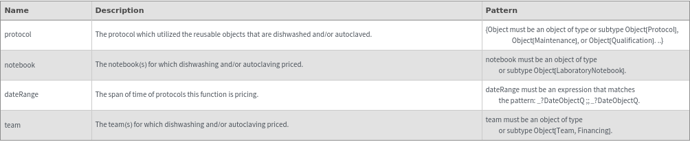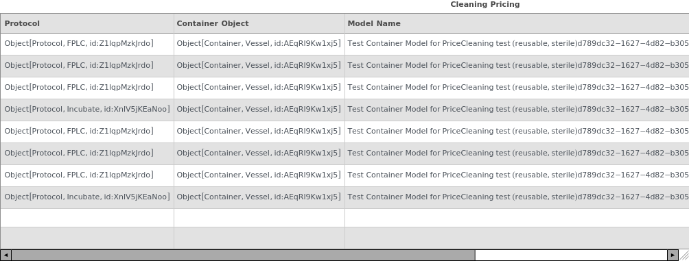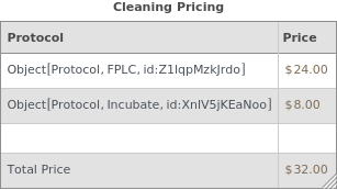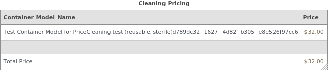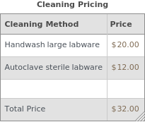 Displays the pricing information for washing and autoclaving reusable objects used in a protocol as a table: