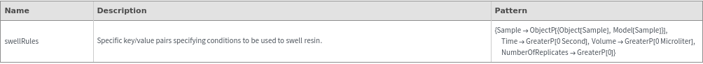 Sample ObjectP[{Object[Sample],Model[Sample]}] The solution which will be used to perform the swell. Time GreaterP[0 Second] The amount of time for which the swell solution will be mixed with the resin. Volume GreaterP[0 Microliter] The volume of swell solution used. NumberOfReplicates GreaterP[0] Number of times the swell step will be repeated. -