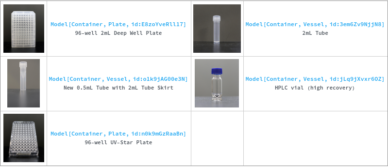 Default Calculation: Automatically set as the PreferredContainer for the Volume of the sample. For plates, attempts to fill all wells of a single plate with the same model before using another one.