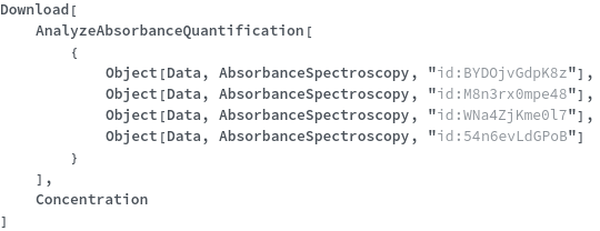 If the output data is outside of the recommended linear range of the instrument, AnalyzeAbsorbanceQuantification will throw a warning because quantifications may be less reliable.
