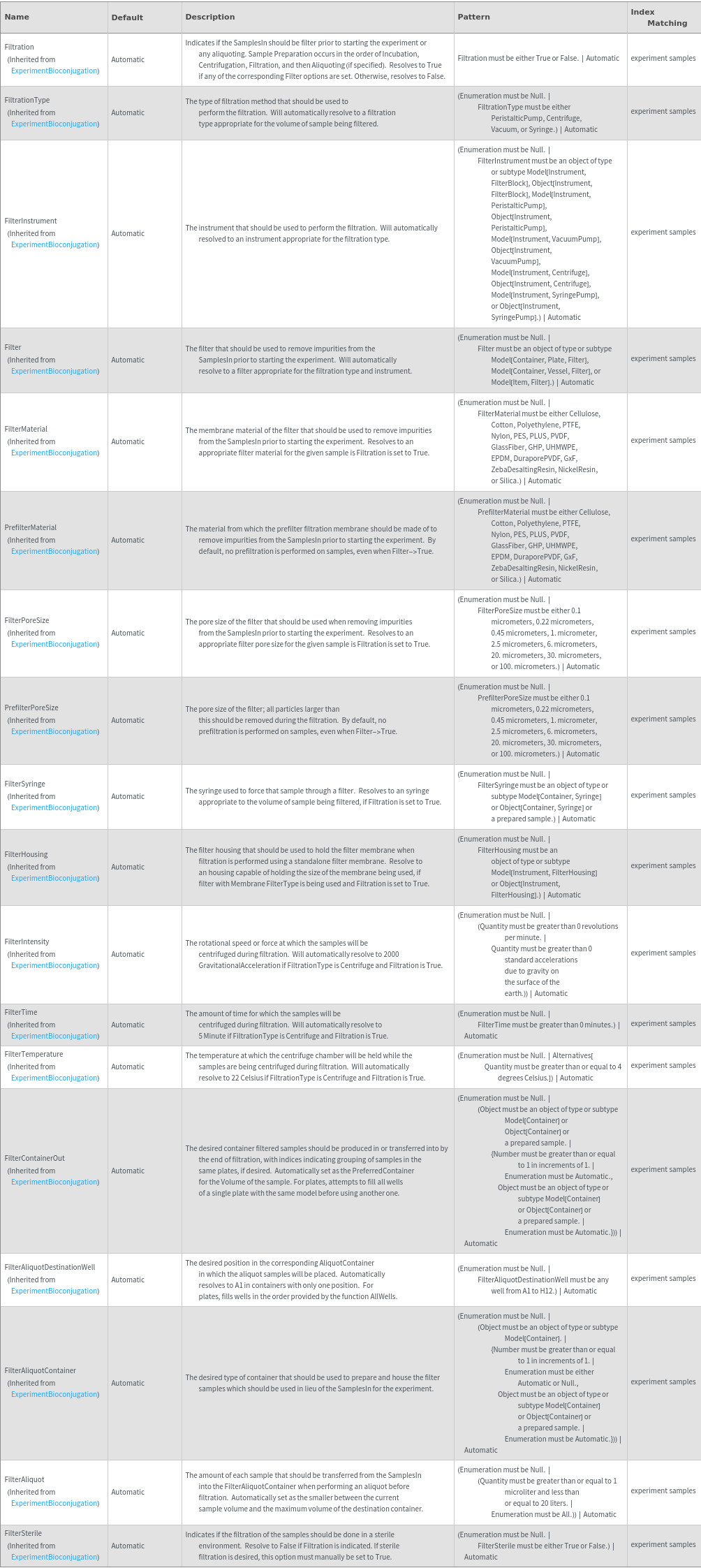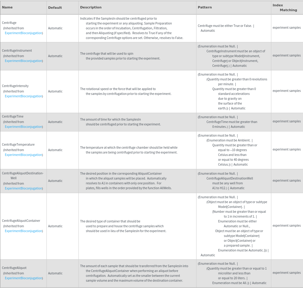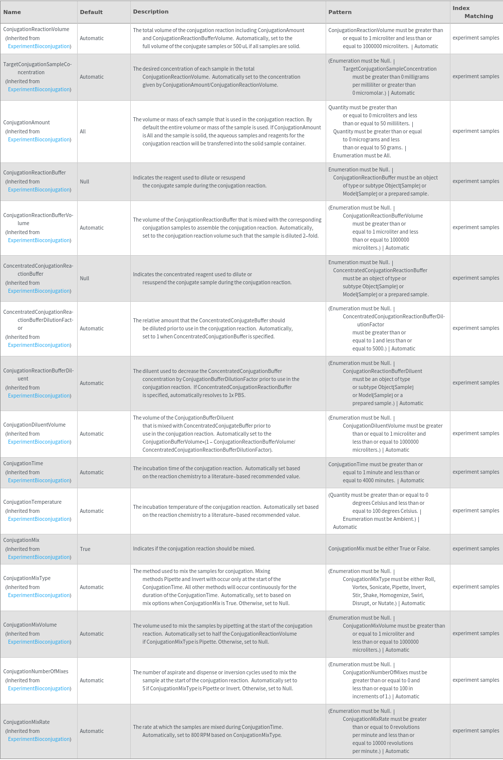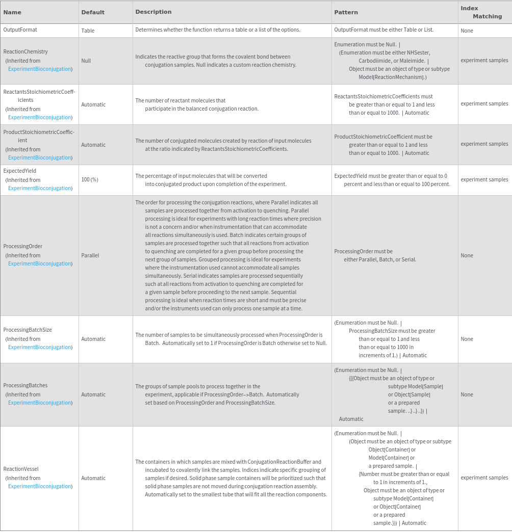 - The options returned by this function may be passed directly to ExperimentBioconjugation.