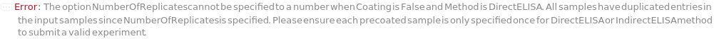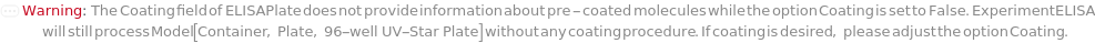 Specifies whether ELISAPlate(s) require coating prior to the immunosorbent steps, indicating that the plates are not pre-coated. When pre-coated ELISA plates are not used, coating is required during this experiment. Coating is a procedure to immobilize coating analytes (usually antigens and antibodies) to the surface of the assay plate(s) through non-specific adsorption. The ELISAPlate(s) are coated with samples for DirectELISA or IndirectELISA, CaptureAntibodies for DirectSandwichELISA or IndirectSandwichELISA, ReferenceAntigens for DirectCompetitiveELISA or IndirectCompetitiveELISA, and CoatingAntibodies for FastELISA. See Figure 3.1 for more information about ELISAPlate configurations across different methods.