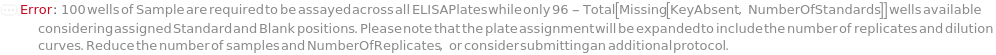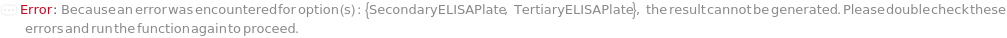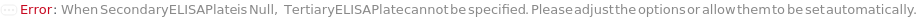 Default Calculation: If samples are pre-coated to more than two plates, TertiaryELISAPlate is automatically set to the third corresponding pre-coated plate. If the total number of Sample (including spiked samples and dilutions) times NumberOfReplicates plus standards, blanks, and moating samples exceeds 192, TertiaryELISAPlate is automatically set to the same model as ELISAPlate.