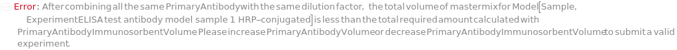 Default Calculation: If Method is DirectELISA, IndirectELISA, DirectSandwichELISA, or IndirectSandwichELISA and BlankPrimaryAntibodyDilutionFactor is not Null or 1, automatically set to 1.1*BlankPrimaryAntibodyImmunosorbentVolume/BlankPrimaryAntibodyDilutionFactor. If Method is DirectCompetitiveELISA, IndirectCompetitiveELISA, or FastELISA and Blank is specified, automatically set to the same value as the option PrimaryAntibodyVolume.
