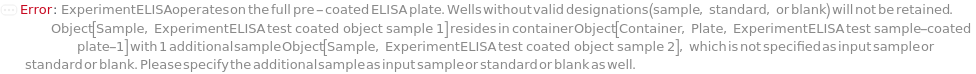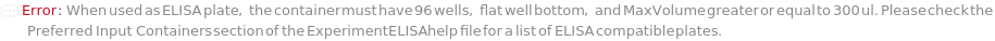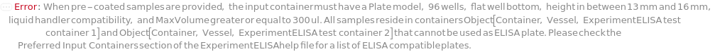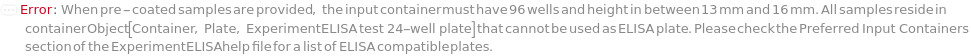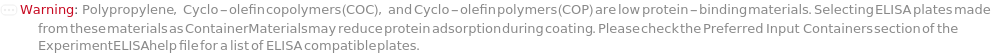 Default Calculation: If samples are pre-coated to a plate, ELISAPlate is automatically set to the corresponding pre-coated plate. Otherwise, ELISAPlate is automatically selected based on DetectionMode. When DetectionMode is AbsorbanceIntensity, ELISAPlate is automatically set to Model[Container, Plate, "96-well Polystyrene Flat-Bottom Plate, Clear"], which is optimized for absorbance measurements. When DetectionMode is FluorescenceIntensity, ELISAPlate is automatically set to Model[Container, Plate, "96-well Black Wall Greiner Plate"], which minimizes cross-talk and reduces background fluorescence. When DetectionMode is LuminescenceIntensity, ELISAPlate is automatically set to Model[Container, Plate, "96-well plate, High Binding, White Opaque"], which minimizes cross-talk and enhances luminescence signal reflection.