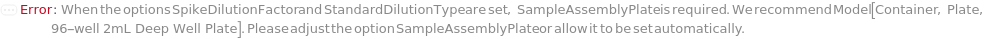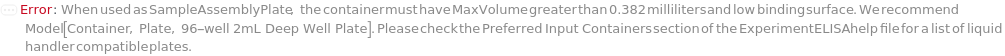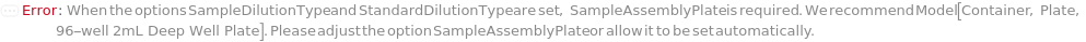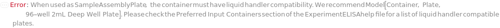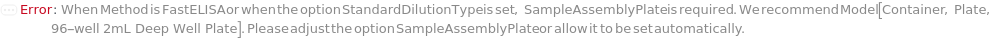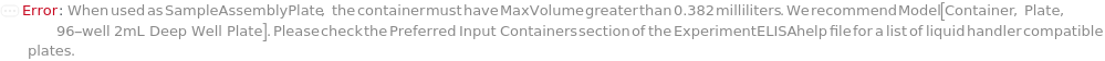 Default Calculation: If Method is DirectELISA, IndirectELISA, DirectSandwichELISA, or IndirectSandwichELISA and at least one sample or standard requires Serial or Linear dilution, or if Method is DirectCompetitiveELISA, IndirectCompetitiveELISA, or FastELISA, automatically set SampleAssemblyPlate to Model[Container, Plate, "96-well 2mL Deep Well Plate"].