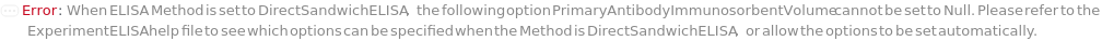 Default Calculation: If the Method is set to DirectELISA, IndirectELISA, DirectSandwichELISA, or IndirectSandwichELISA and Blank is specified, automatically set to the same value as PrimaryAntibodyImmunosorbentVolume.