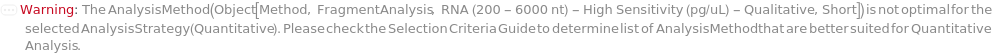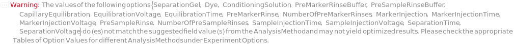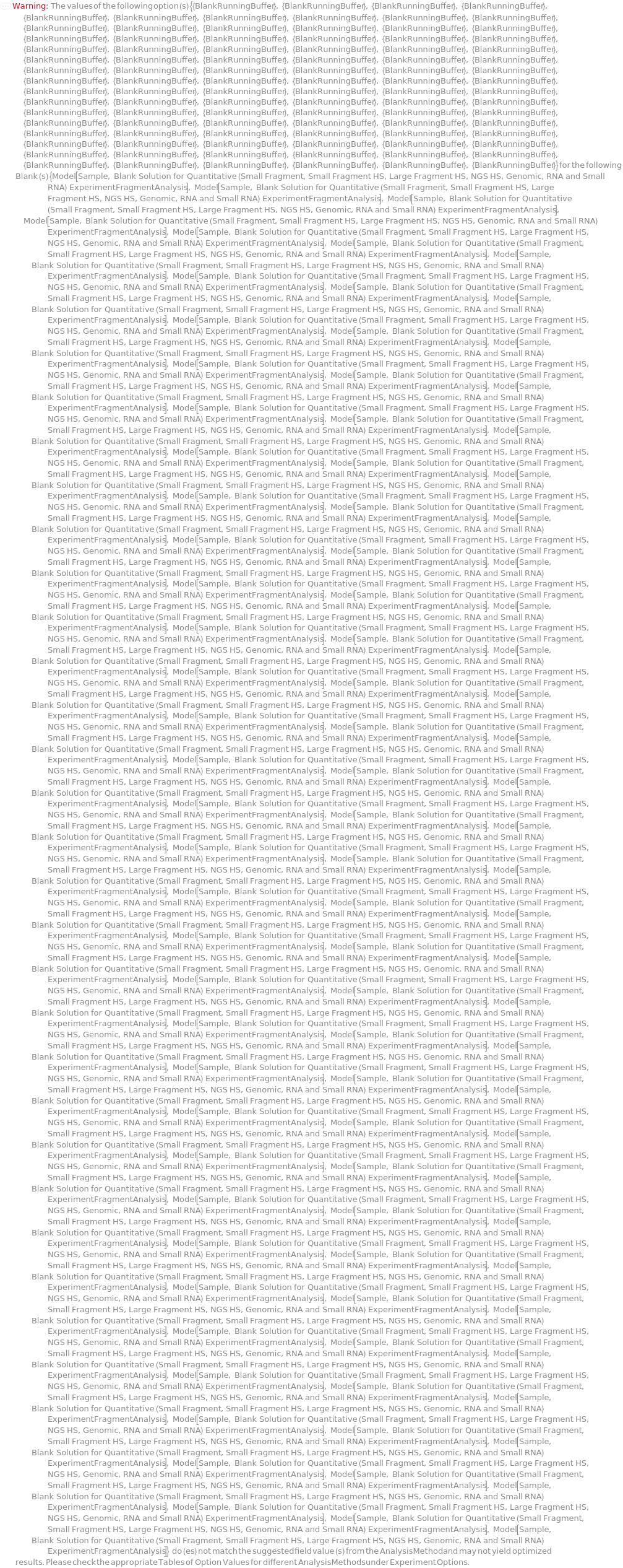The method object that contains a set of option values optimized and recommended by the instrument manufacturer that is used as a template for the parameters of the experiment. If not specified by User, an AnalysisMethod is selected from a list of methods for either standard dsDNA or RNA samples according to a selection criteria based on AnalysisStrategy, CapillaryArrayLength and sample information: type of analyte (DNA or RNA), analyte concentrations (High Sensitiviy (Picogram/Microliter) or Standard Sensitivity (Nanogram/Microliter)) and fragment size range (ReadLength, in base pairs or number of nucleotides) of the sample. For more specialized samples (eg DNA smears, plasmid DNA, cfDNA, NGS libraries, samples for CRISPR/Cas9, genomic DNA), it is recommended that AnalysisMethod is selected and specified. For a selection criteria guide on determining the appropriate AnalysisMethod, refer to Figure 3.1 under AnalysisMethod of Experiment Options. Default option values for each AnalysisMethod, including reagents (SeparationGel, LoadingBuffer, Ladder, Blank, Marker, PreMarkerRinseBuffer, PreSampleRinseBuffer), as well as specific parameters of the experiment categories (eg. Sample Preparation, Capillary Conditioning, Capillary Equilibration, Pre-Marker Rinse, Marker Injection, Pre-Sample Rinse, Sample Injection, Separation) are specified in fields of the various Object[Method, FragmentAnalysis] objects available.