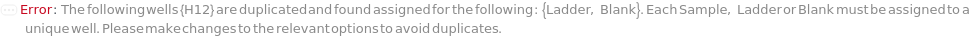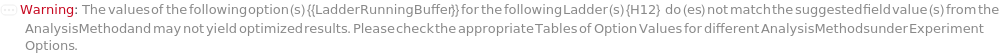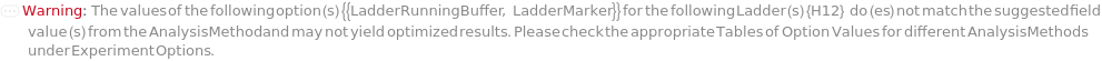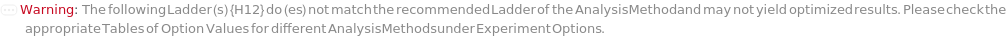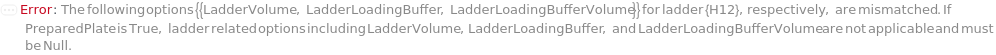 Default Calculation: If PreparedPlate is False, automatically set to the Ladder field of the AnalysisMethod and is dispensed to occupy successive wells until Position H12 for a 96-capillary array. If PreparedPlate is True, automatically set to {"H12"} unless Well Position(s) are specified. For a list of the default Ladders for each AnalysisMethod, see Figure 3.3 under Ladder of Experiment Options. At ladder is always required at Position H12.
