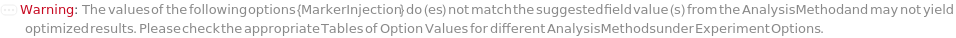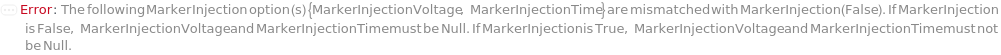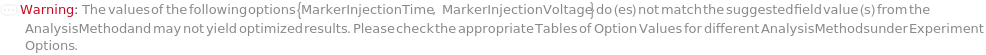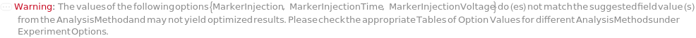 Default Calculation: If the AnalysisMethod is specified, automatically set to the MarkerInjectionTime field of the AnalysisMethod. If MarkerInjection is True and AnalysisMethod is not specified, automatically set to 5 Second. For a list of the default MarkerInjectionTime for each AnalysisMethod, see Figure 3.9 under MarkerInjection of Experiment Options.