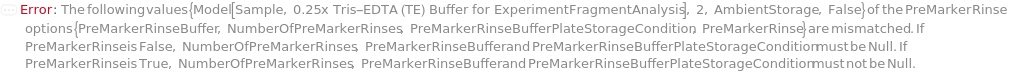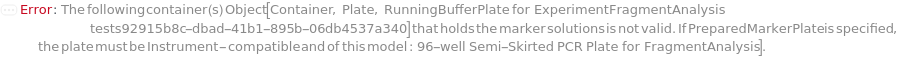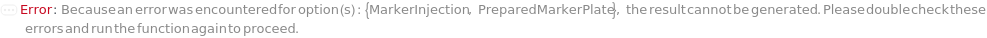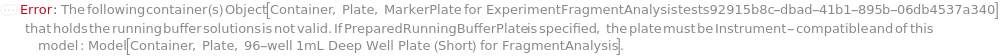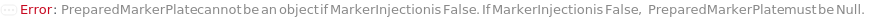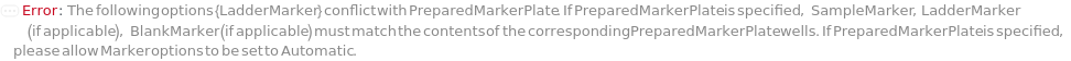 Default Calculation: If PreparedMarkerPlate is specified, set to the content(s) of the well matching the WellPosition of the SamplesIn. If PreparedMarkerPlate is Null and MarkerInjection is True, automatically set to the SampleMarker field of the AnalysisMethod, if not Null. If PreparedMarkerPlate is Null and MarkerInjection is True and SampleMarker field of AnalysisMethod is Null, automatically set to Model[Sample, "35 bp and 5000 bp Markers for ExperimentFragmentAnalysis"].