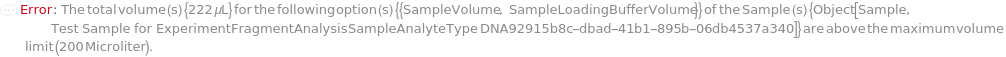 Default Calculation: Automatically set to the SampleLoadingBufferVolume field of the AnalysisMethod. If PreparedPlate is True, automatically set to Null. For a list of the default SampleLoadingBufferVolume for each AnalysisMethod, see Figure 3.2 under SampleLoadingBuffer of Experiment Options.