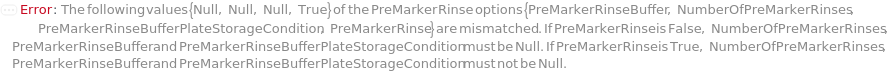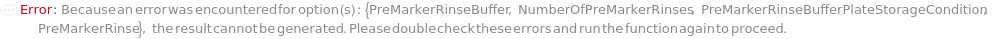 Default Calculation: If PreMarkerRinse is True, automatically set to the PreMarkerRinseBuffer field of the AnalysisMethod. For a list of the default PreMarkerRinseBuffer for each AnalysisMethod, see Figure 3.8 under PreMarkerRinse of Experiment Options.