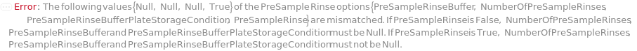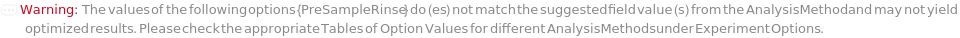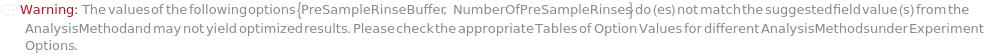 Default Calculation: If PreSampleRinse is True, automatically set to the PreSampleRinseBuffer field of the AnalysisMethod. For a list of the default PreSampleRinseBuffer for each AnalysisMethod, see Figure 3.10 under PreSampleRinse of Experiment Options.