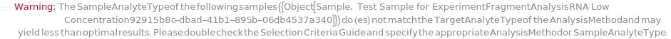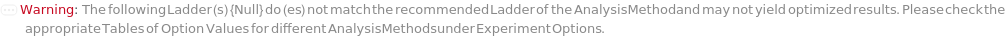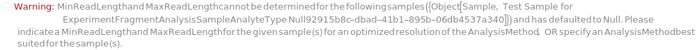 Default Calculation: Automatically set to appropriate Object[Method,FragmentAnalysis] based on AnalysisStrategy, CapillaryArrayLength and sample information: type of analyte (equal to TargetAnalyteType field in the AnalysisMethod), analyte concentration (greater than MinTargetConcentration field and less than MaxTargetConcentration field of AnalysisMethod) and fragment size range (MinReadLength greater than or equal to MinTargetReadLength field and MaxReadLength less than or equal to MaxTargetReadLength field of the AnalysisMethod), if available. For a selection criteria guide on determining the appropriate AnalysisMethod, refer to Figure 3.1 under AnalysisMethod of Experiment Options.