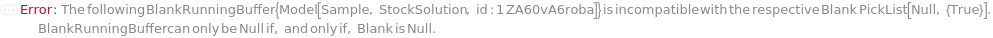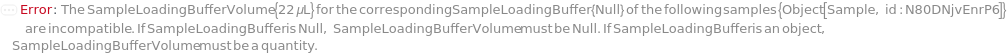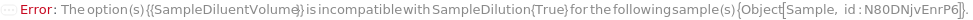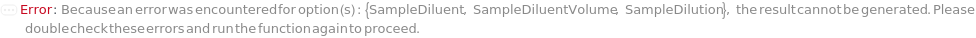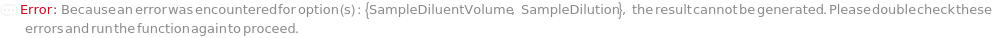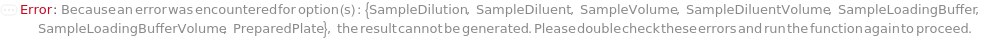 Default Calculation: If SampleDilution is set to True, automatically determined based on the concentration of the identity models of PolymerType matching SampleAnalyteType under Composition, and the MaxTargetMassConcentration field of the AnalysisMethod. Otherwise, automatically set to the difference between SampleVolume and TargetSampleVolume. If PreparedPlate is True, automatically set to Null.