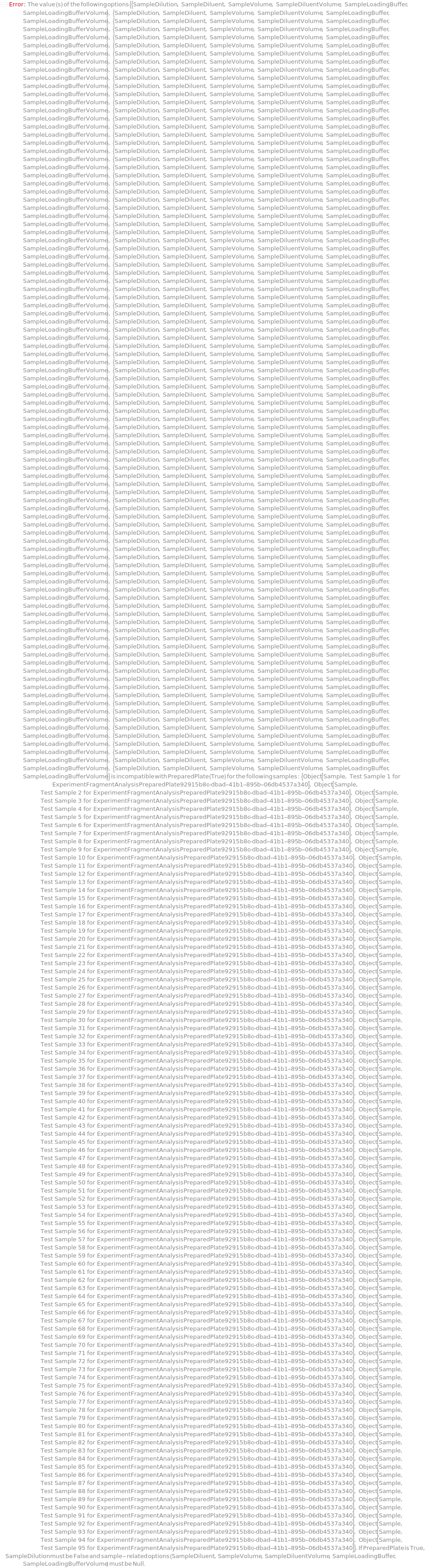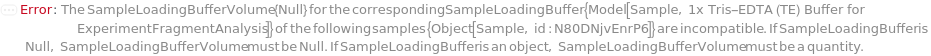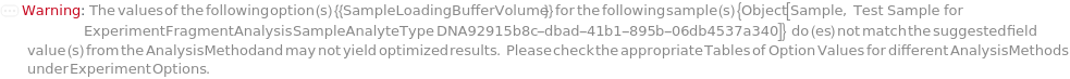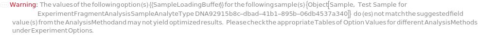 Default Calculation: Automatically set to the SampleLoadingBuffer field of the AnalysisMethod. If PreparedPlate is True, automatically set to Null. For a list of the default SampleLoadingBuffer for each AnalysisMethod, see Figure 3.2 under SampleLoadingBuffer of Experiment Options.