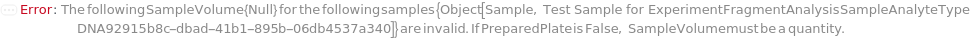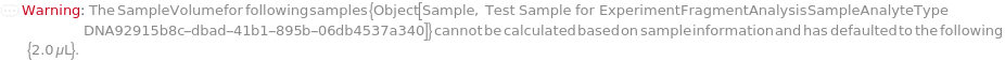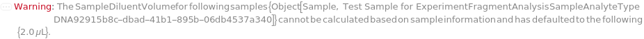 Default Calculation: If SampleDilution is False, automatically set to the TargetSampleVolume field of the AnalysisMethod. If SampleDilution is True, automatically determined based on the concentration of the first identity model of PolymerType DNA or RNA under Composition, and the MaxTargetMassConcentration field of the AnalysisMethod. Otherwise, automatically set to 2 Microliter. If PreparedPlate is True, automatically set to Null.
