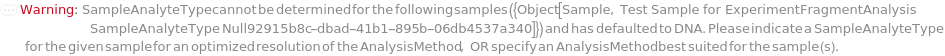 Default Calculation: Automatically set to the most PolymerType that is either DNA or RNA that can be found under Analytes. If Analytes is not populated, automatically set to the most PolymerType that is either DNA or RNA that can be found under Composition. Otherwise, set to DNA.