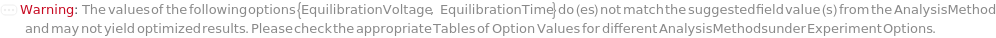 Default Calculation: Automatically set to the SampleInjectionVoltage field of the AnalysisMethod. For a list of the default SampleInjectionVoltage for each AnalysisMethod, see Figure 3.12 under SampleInjectionVoltage of Experiment Options.