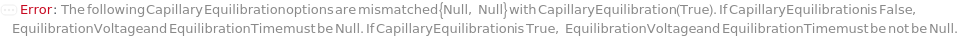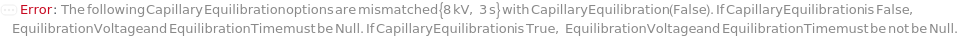 Default Calculation: If CapillaryEquilibration is set to False, automatically set to Null. If CapillaryEquilibration is set to True and EquilibrationVoltage field of the AnalysisMethod is not Null, set to the EquilibrationVoltage field of the AnalysisMethod. If CapillaryEquilibration is set to True and EquilibrationVoltage field of the AnalysisMethod is Null, set to the 8.0 Kilovolt.