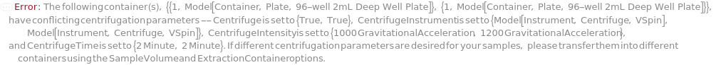 Default Calculation: Automatically set to True any of the other centrifuge options are specified (CentrifugeInstrument, CentrifugeIntensity, CentrifugeTime). Also automatically set to True if ExtractionTechnique -> Pipette and the samples are in a centrifuge compatible container (the Footprint of the container is set to Plate). Otherwise, set to False.