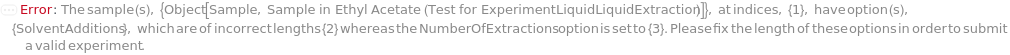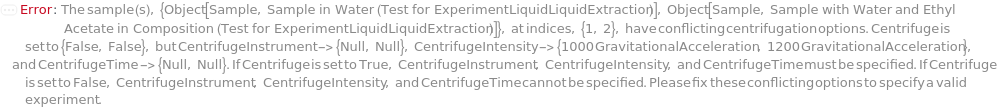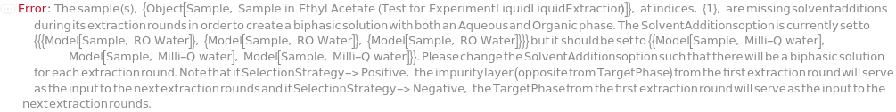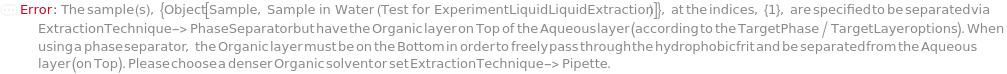 Default Calculation: Automatically calculated from the density of the input sample's aqueous and organic layers (if present in the input sample), the density of the AqueousSolvent and OrganicSolvent options (if specified), and the TargetPhase option. If density information is missing for any of these previously mentioned samples/layers, a warning will be thrown and it will be assumed that the Aqueous layer is on Top (less dense) than the Organic layer. During the calculation of this option, it is assumed that the additional molecules from the input sample will not significantly affect the densities of the aqueous and organic layers. It is also assumed that the Aqueous and Organic layers are fully separated after each round of extraction.