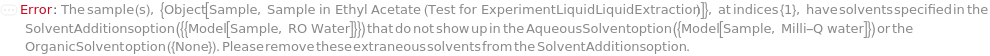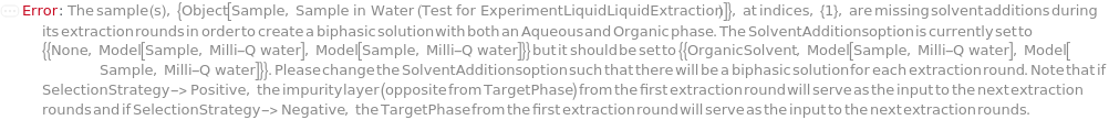 Default Calculation: Aqueous solvent is automatically added if the starting sample of each extraction round is of Organic or Unknown phase. Organic solvent is automatically added if the starting sample of each extraction round is of Aqueous or Unknown phase. If the sample is already Biphasic, the no solvent is added. Note that the phase of the starting sample in extraction rounds 2 and above is dependent on the TargetPhase and SelectionStrategy options.