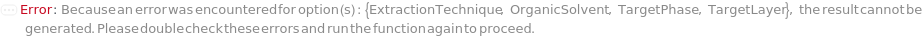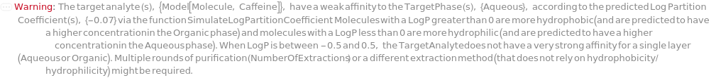 Default Calculation: Automatically set to the phase (Organic or Aqueous) that the TargetAnalyte is more likely to be present in after extraction according to the PredictDestinationPhase[...] function. If there is not enough information for PredictDestinationPhase[...] to predict the destination phase of the target molecule, a warning will be thrown and TargetPhase will default to Aqueous. For more information, please refer to the PredictDestinationPhase help file.