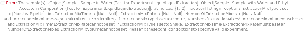 Default Calculation: Automatically set to the lesser of 1/2 of the volume of the sample plus any additional components (SampleVolume, AqueousSolventVolume (if specified), OrganicSolventVolume (if specified), and DemulsifierAmount (if specified)) and 970 Microliter (the maximum amount of volume that can be transferred in a single pipetting step on the liquid handling robot) if ExtractionMixType is set to Pipette. Otherwise, set to Null.