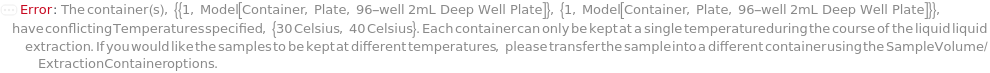 Default Calculation: Automatically set to Model[Container, Plate, "96-well 2mL Deep Well Plate"] if TargetPhase -> Organic and ExtractionTechnique -> PhaseSeparator (since the organic layer will flow through the phase separator's hydrophobic frit, TargetContainerOut will be used as the collection container for the phase separator). Otherwise, automatically set to a robotic compatible container that can hold the volume of the target layer via PreferredContainer[...].