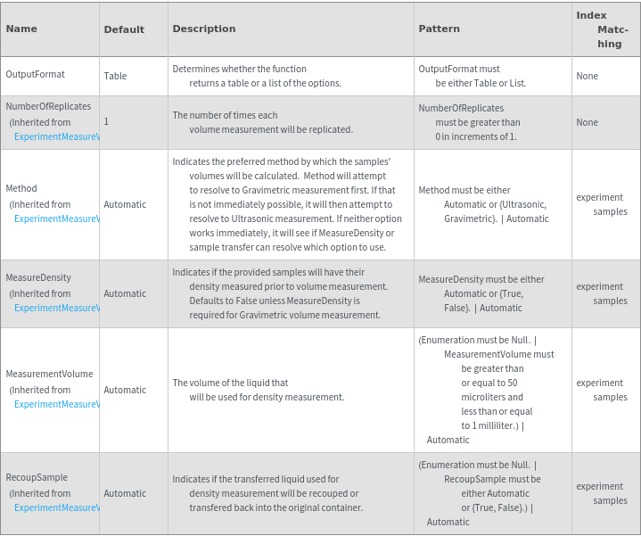 - The options returned by this function may be passed directly to ExperimentMeasureVolume.