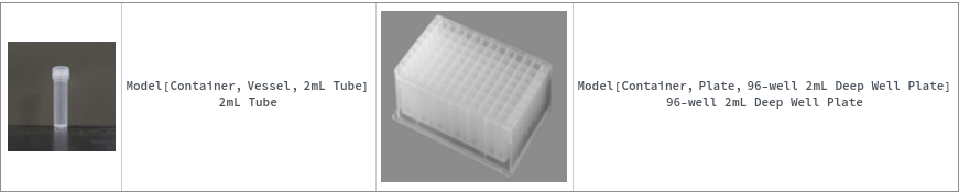 Default Calculation: Automatically set as the PreferredContainer for the Volume of the sample. For plates, attempts to fill all wells of a single plate with the same model before using another one.