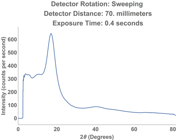 During transfer of the sample, an insufficent amount of diffracting material is added to the well such that no diffraction peaks are observed when the well is analyzed. Ensure the slurry is sufficiently concentrated so that diffracting sample is present in the well. In the figure below, a well did not contain enough material to diffract and produced a diffractogram characteristic of transmission through an amorphous material (the well plate).