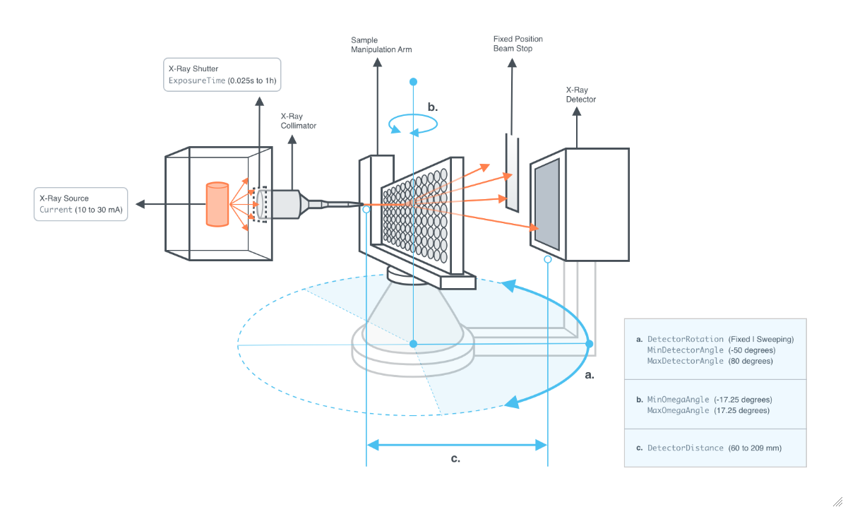 Figure 2.1.1: Powder samples are loaded into a 96-well plate, and an X-ray beam is transmitted through each sample from the exit of the X-ray collimator into the X-ray detector on the opposite side of the sample. A fixed position beam stop prevents transmission of X-rays that are not diffracted to the beam detector, protecting the detector from damage that could result from the high flux of radiation. The X-ray detector is rotated about a central axis to collect diffracted X-rays from -50° to 80° 2θ. The sample holder may also rotate the sample ω angle (an ω angle of 0° indicates the sample plate is perpendicular to the X-ray source), increasing the range of the XRD pattern up to 34.5 degrees in total (17.25 degrees in either direction).