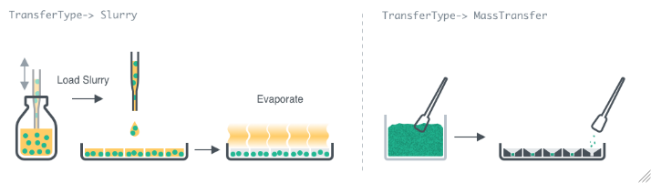 Figure 3.1: Crystallization plate preparation. Left: When TransferType is Slurry, a suspension of solid (or dissolved solid) is aspirated into wells of the crystallization plate. Afterwards, solvent is removed by evaporation to isolate the solid sample. Right: When TransferType is MassTrasnfer, a finely-ground solid is dispensed to a funnel-shaped well of the crystallzation plate. Solid is tamped into ~0.5 mm diameter capillary at the base of the funnel.