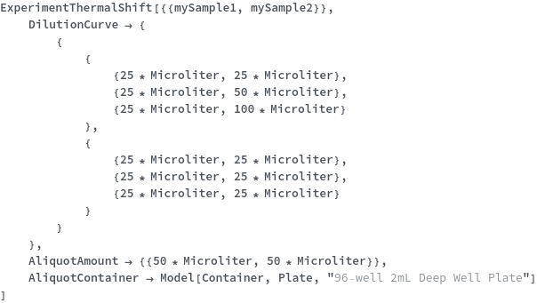 The desired type of container that should be used to prepare and house the aliquot samples, with indices indicating grouping of samples in the same plates, if desired. This option will resolve to be the length of the SamplesIn * NumberOfReplicates.