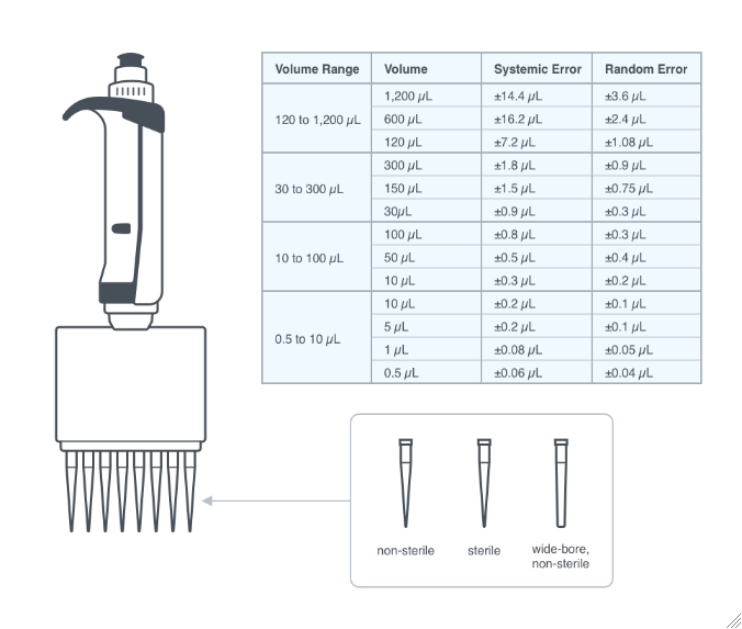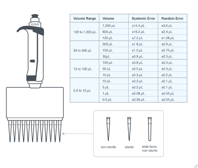 Figure 2.1.1: The diagram above lists the available pipette sizes and corresponding tip types that are available in the ECL.