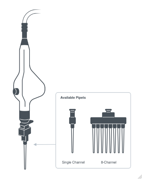 Figure 2.5.1: The aspirator can be used to aspirate any volume from a sample using a single channel or 8 channels. Aspirators are currently only available in the BSC (both Microbial and Tissue Culture) and are used for cell culture applications.