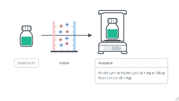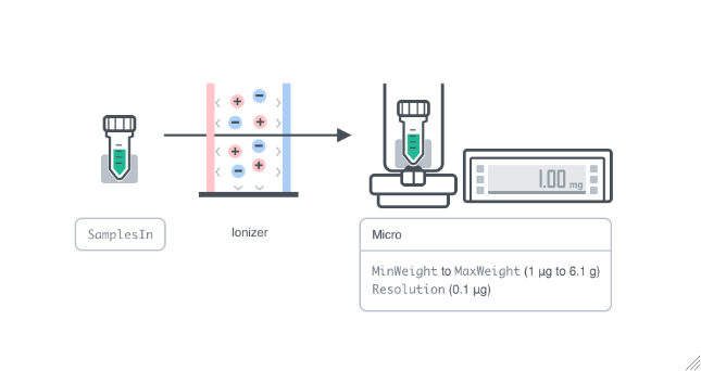 Figure 2.6.1: Items are transferred through an ionizer, which floods the local environment with positive and negative ions. This removes any static electricity that has built up on items and provides a more stable and accurate mass reading.The user must explicitly specify the Micro-Balance using the option Instrument -> Model[Instrument,Balance,"id:54n6evKx08XN"] if so desired.