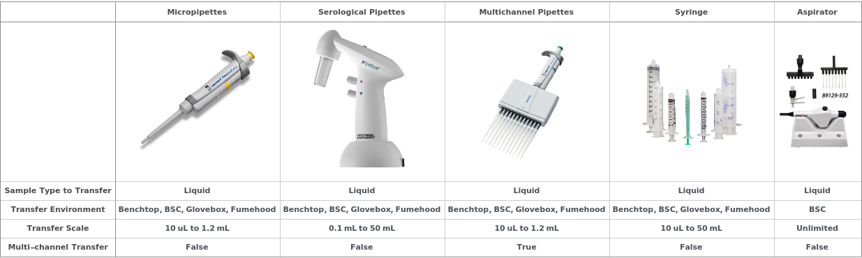 Figure 2.2.1: The above diagram lists the compatible serological tip sizes that are available at the ECL.