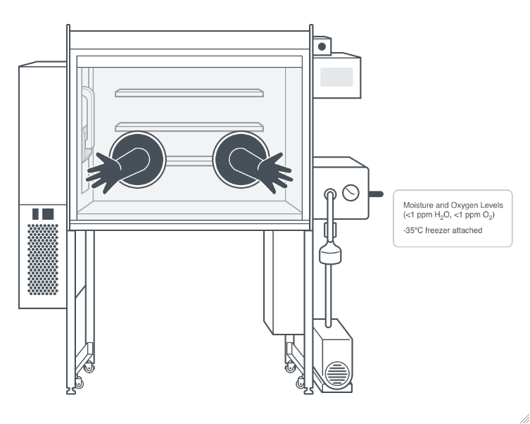 Figure 2.12.1: The glove box can be used to perform transfers under an inert atmosphere. Note that certain samples (InertCatalystIncompatible->True) cannot be used inside of the glove box. This is because some samples that contain sulfur and sulfur compounds (such as H2S, RSH, COS, SO2, SO3) deactivate the catalyst that is used in the glove box to remove traces of water and oxygen. Large quantities of halides, chlorides, halogen (Freon), alcohol, hydrazine, phosphene, arsine, arsenate, mercury, and saturation with water may also deactivate the catalyst.