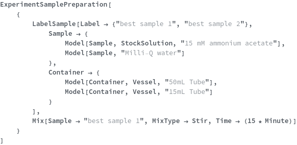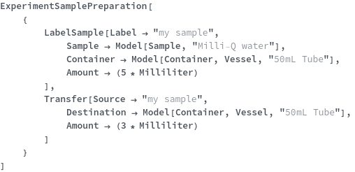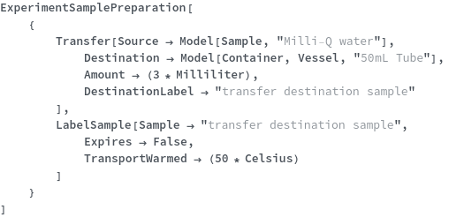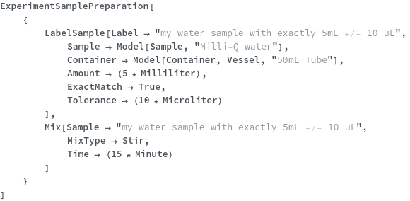 The ExactAmount option is an advanced option that indicates that a sample with a precise Amount must be used for the experiment. If this option is set to False, a sample with MORE than the requested Amount of volume/mass/count can be used by LabelSample (ex. one already exists in inventory) - this can save time in the lab by reducing unnecessary transfers. When the Amount option is set explicitly by the user, the ExactAmount option is always automatically set to True. The criteria of what counts as an "exact match" can also be controlled using the Tolerance option. The following LabelSample unit operation will request for a water sample in a 50mL tube that contains 5mL +/- 10 uL.