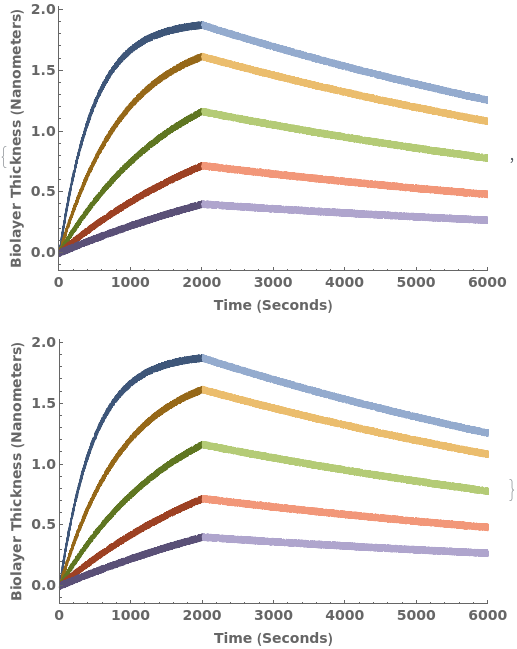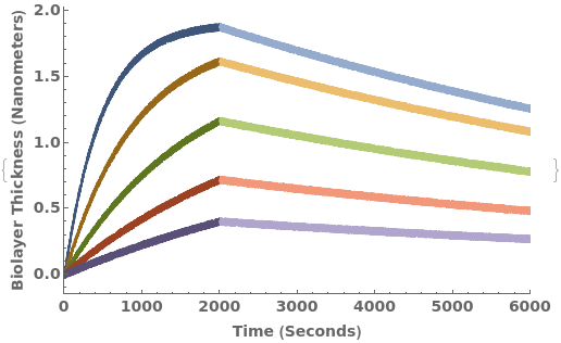 Given an unanalyzed Object[Data,BioLayerInterferometry] with kinetics data, PlotBioLayerInterferometry returns an plot: