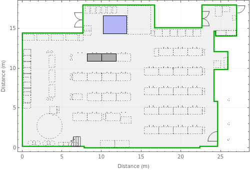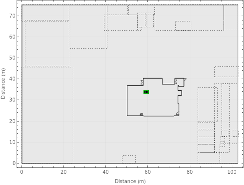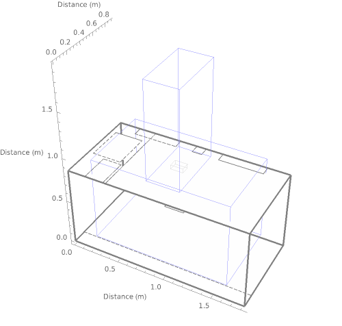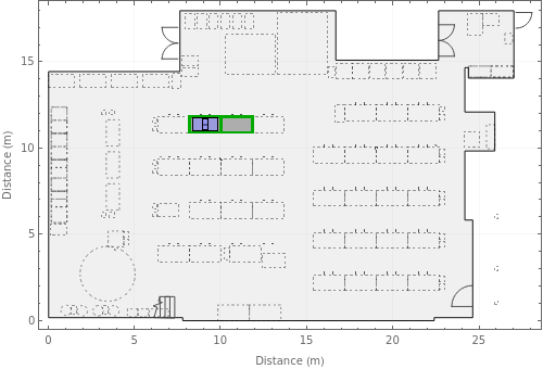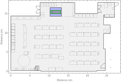 Plot the location of an instrument in the context of the building that holds it in 3D: