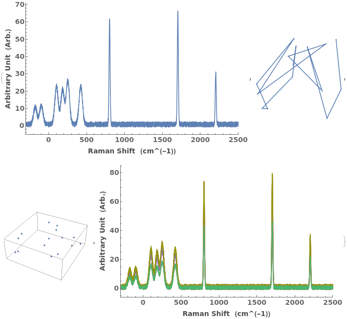 plots the average collected Raman spectrum, Raman spectra from each sampling point, and the sampling pattern for RamanSpectroscopyData.