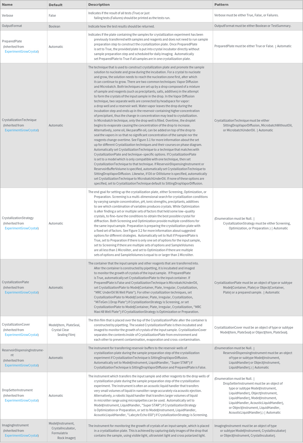 • This function runs a series of tests to ensure that the provided inputs/options, when passed to ExperimentGrowCrystal proper, will return a valid experiment.
